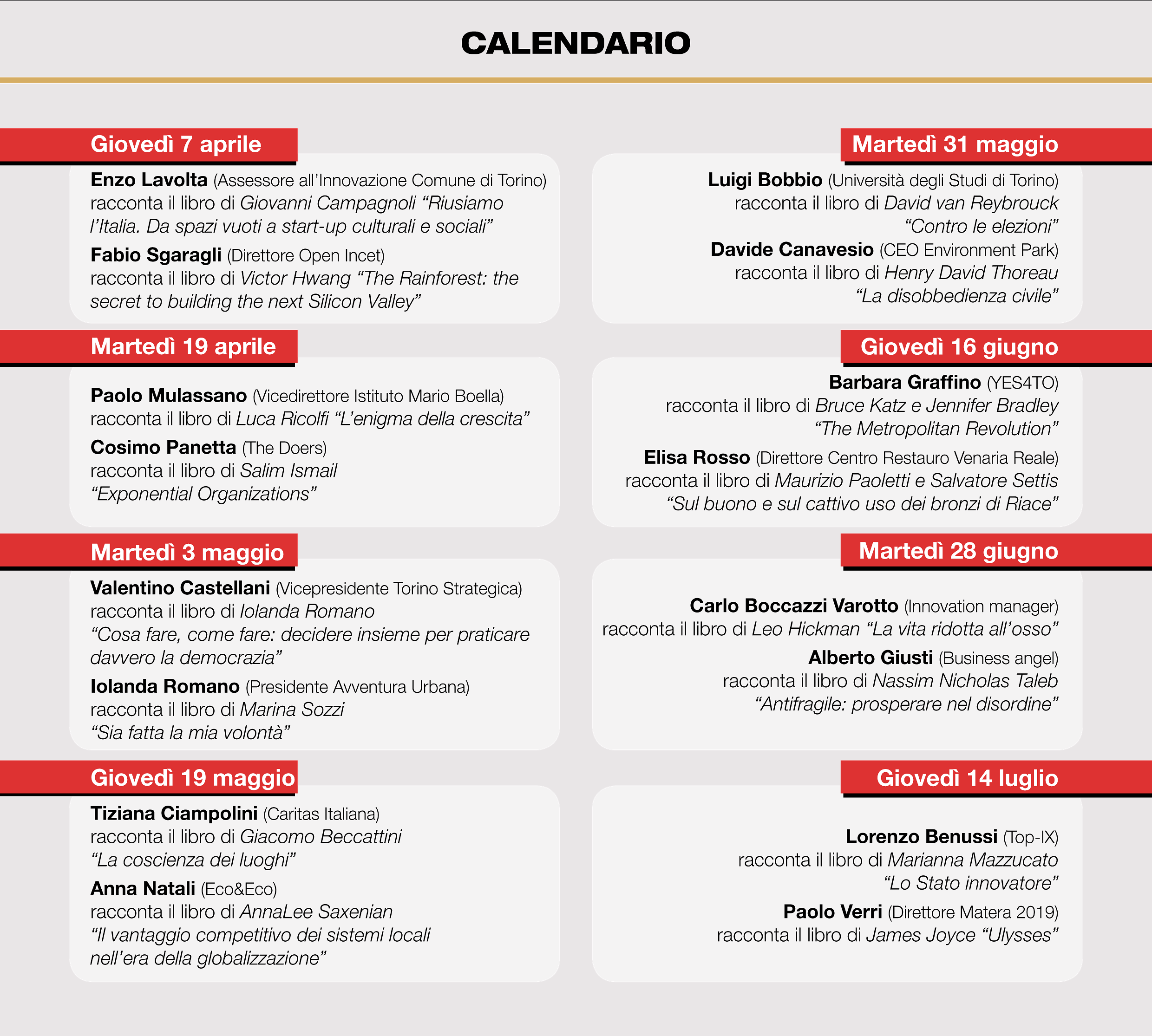 I selezionati riceveranno conferma tramite email il 15 Gennaio 2019 e dovranno partecipare al primo appuntamento del percorso previsto per il giorno 4 Febbraio dalle 09.00 alle 13.00 presso il Centro Open Incet, Via Cigna 96/17.